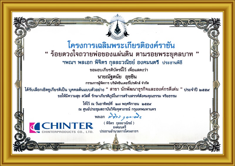 คุณ ณัฐดนัย อุชชิน กรรมการผู้จัดการ บริษัท ชินเตอร์โปรดักส์ จำกัด ได้รับเลือกเป็นบุคคลต้นแบบตัวอย่าง สาขา นักพัฒนาธุรกิจและองค์กรดีเด่น ประจำปี พ.ศ.2559 จากโครงการเฉลิมพระเกียรติองค์ราชัน “ร้อยดวงใจ ถวายพ่อของแผ่นดิน ตามรอยพระยุคลบาท”